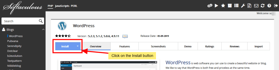 This will take you to the WordPress page, click on the Install button here which will display the install form.